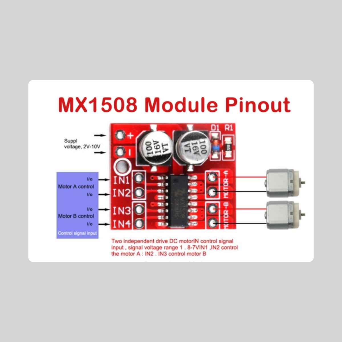 The MX1508 is perfectly suited for miniature robot cars, DIY smart toys, motorized models, and any low-voltage, battery-powered project that requires simple and effective motor control. It works seamlessly with 3.3V and 5V microcontrollers like Arduino, ESP8266, ESP32, and Raspberry Pi.